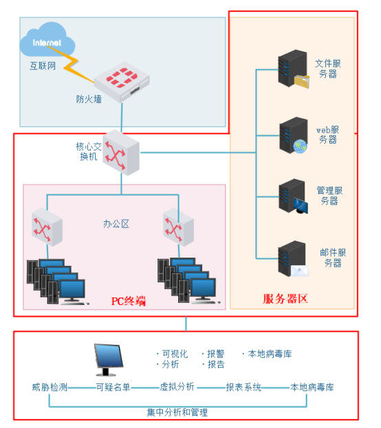 如上所述,爲了給企業提供一個有機統一的安全環境,更加有效的防範APT網絡攻擊,客戶在企業中部署如下圖所示的分層中式網絡安全架構